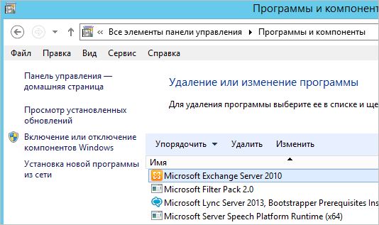Запускаем программу деинсталляции через Панель управления — Программы и компоненты (или команда appwiz.cpl). Выбираем Exchange и нажимаем на кнопку удалить: