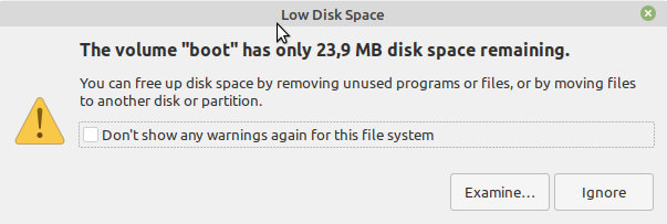 The volume «boot» has only XX MB space remaining