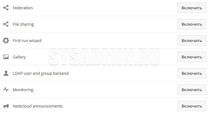 В списке приложений, нужно перейти на вкладку «Отключенные«, и найти там «LDAP User and group backend«, и нажать на кнопку «Включить«. Если кнопка серая (не активна), то значит отсутствует необходимое для работы PHP с LDAP расширение.