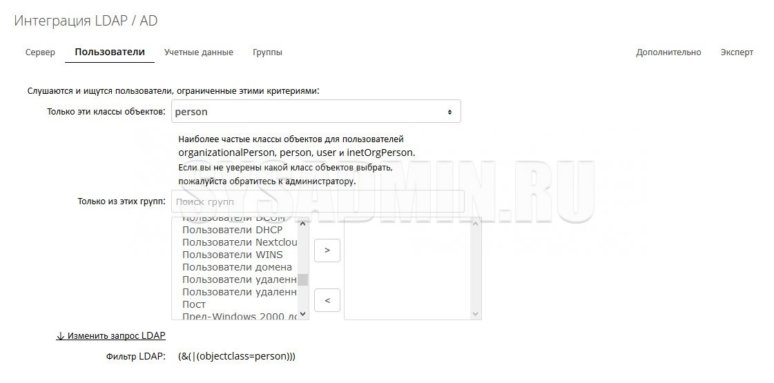 На следующей вкладке предстоит выбрать объекты Active Directory, которые получат возможность авторизации в Nextcloud. По умолчанию выбран класс объектов «Person» — он соответствует учетным записям пользователей домена Active Directory.