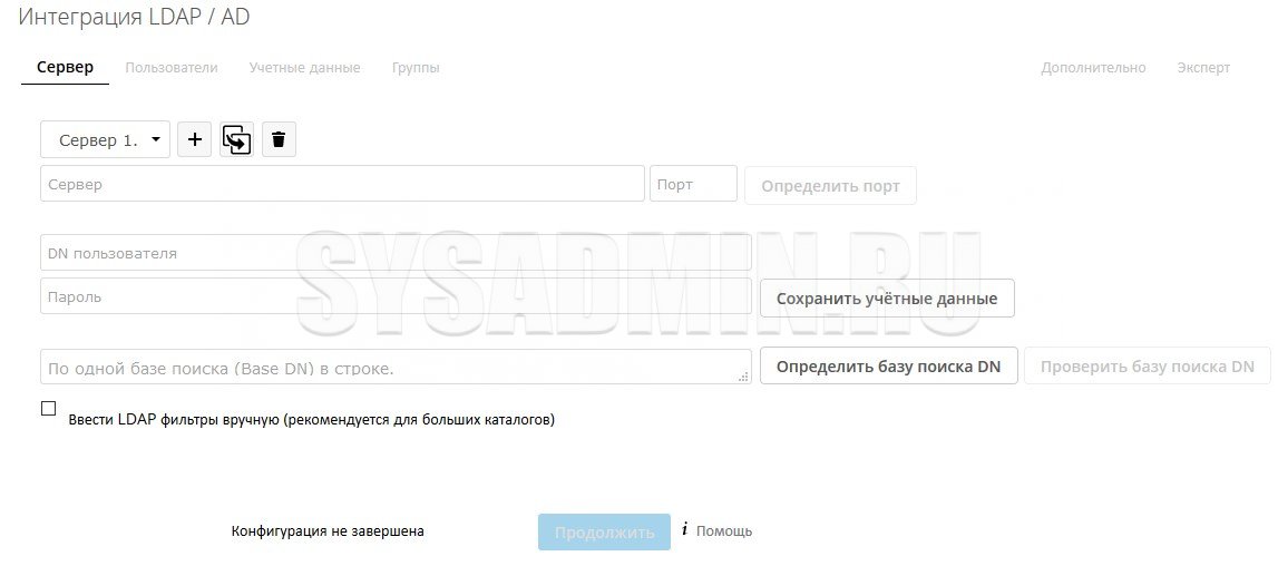 В последнем поле необходимо внести базу поиска, все в том же distinguishedName виде. Возможно и автоматическое заполнение с помощью кнопки «Определить базу поиска DN«. Для проверки корректности введенных данных нужно воспользоваться кнопкой «Проверить базу поиска DN«. Если все введено верно, то станет доступна кнопка перехода на следующую вкладку настроек.