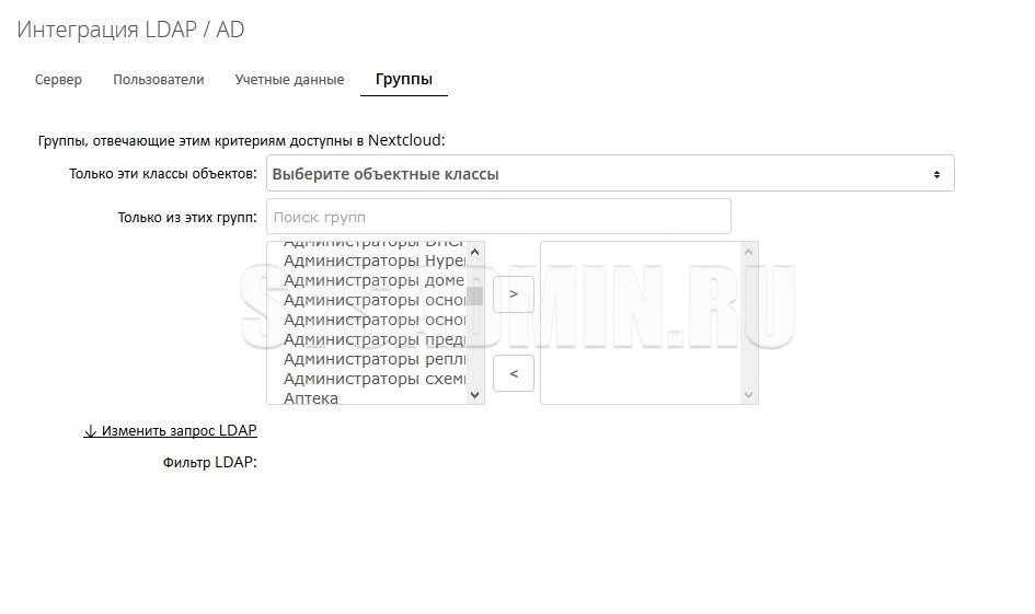 На последней вкладке предоставляется возможность переноса групп из Active Directory в Nextcloud (не путать с переносом пользователей из групп, для этого предназначена вторая вкладка «Пользователи«). По умолчанию ничего не выбрано.