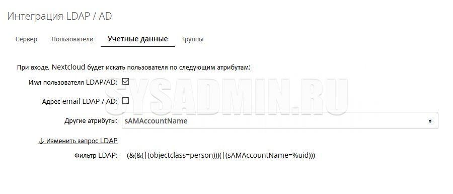 На третьей вкладке, в выпадающем списке под названием «Другие атрибуты» нужно выбрать sAMAccountName, чтобы значение поля «Фильтр LDAP» приняло следующий вид: (&(&(|(objectclass=person)))(|(sAMAccountName=%uid))).