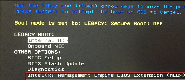 1. В нашем случае, чтобы попасть в меню MEBx, на ноутбуке Dell Latitude E7270 после включения компьютера нужно нажать кнопку F12. На экране выбора режима загрузки нужно выбрать Intel(R) Management Engine BIOS Extension (MEBx).