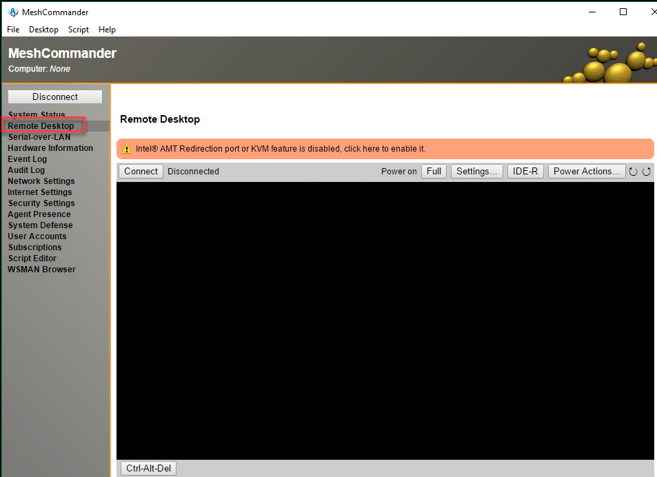 4. Перейдя в данный раздел, вы увидите сообщение «Intel AMT Redirection port or KVM feature is disabled, click here to enable it». Просто нажмите на красную строку для включения KVM