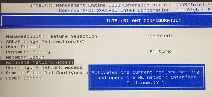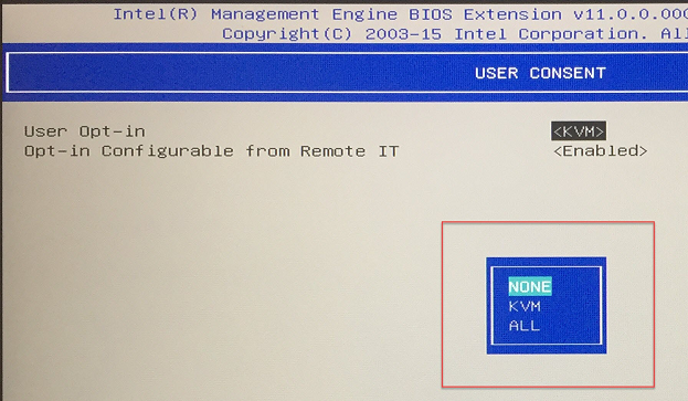 По умолчанию возможность удаленного управления через AMT KVM на компьютерах с поддержкой Intel vPro отключена. Включить ее можно через меню Intel MEBx. Попасть в это меню можно после отображения экрана запуска BIOS/UEFI с помощью сочетания клавиш Ctrl+P или F12 (на некоторых компьютерах можно скрыть это меню с помощью настроек BIOS).