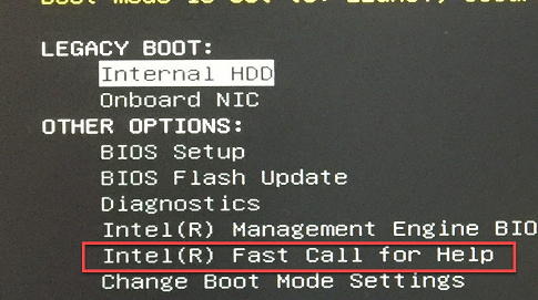11. Теперь, если при загрузке нажат кнопку F12, вы увидите новую опцию Intel(R) Fast Call for Help. Выберите ее и нажмите Enter.