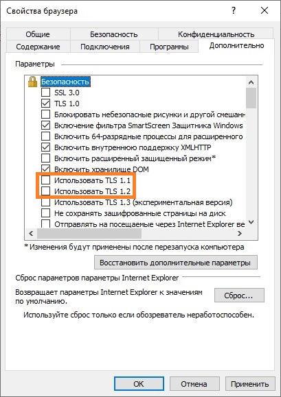 Если первый способ по каким-то причинам не подходит или не сработал, можно попробовать отключить использование протоколов TLS 1.1 и TLS 1.2 в Internet Explorer’e, что должно исправить перезагрузку компьютера. Стоит отметить, что такой способ менее предпочтителен, по скольку для работы некоторых сайтов могут потребоваться протоколы TLS 1.1 и TLS 1.2.