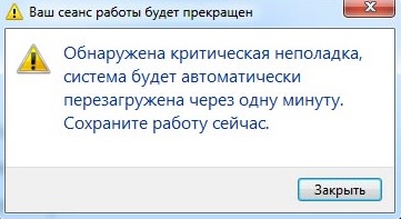 Обнаружена критическая неполадка, система будет перезагружена через одну минуту. Сохраните работу сейчас.
