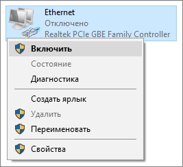 В открывшемся окне нажмите правой кнопкой мыши по значку того сетевого адаптера, который нужно включить / отключить. В контекстном меню будет возможность выбрать соответствующее действие. В данном примере включаем сеть с названием Ethernet