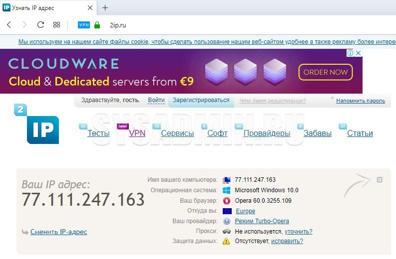 - Проверить, действительно ли вы «сидите в интернете» через VPN можно с помощью множества сервисов по определению IP адреса, например, 2ip.ru.
