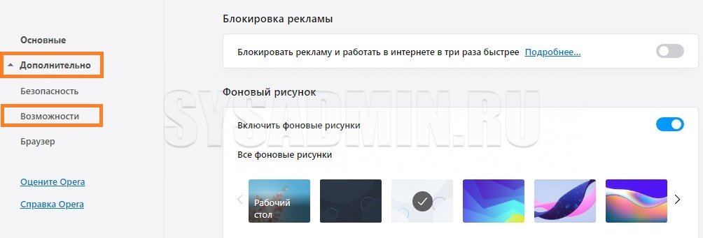 - В левой части окна настроек нажимаем на «Дополнительно», и в раскрывшемся списке выбираем «Возможности».