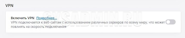 - В окне появится пункт «Включить VPN» со своим переключателем. Нажимаем на него, и с этих пор ваш браузер Opera будет работать через VPN.