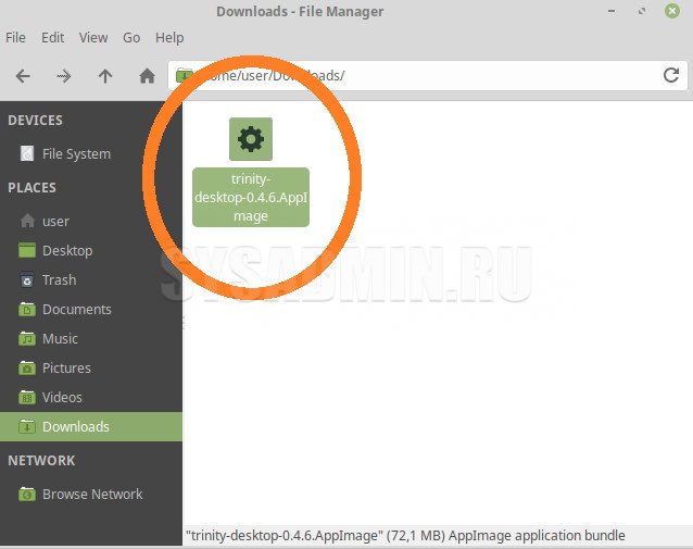 В нашем примере файл trinity-desktop-0.4.6.AppImage лежит в каталоге /home/user/Downloads