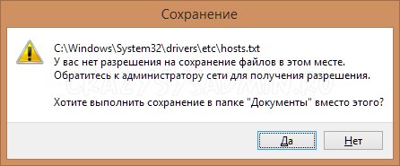 Копируем этот файл (hosts.txt) в любое место, например на рабочий стол, делаем в нем необходимые изменения, сохраняем и потом заменяем старый файл в папке C:WindowsSystem32driversetchosts.txt. Система выведет предупреждение, но даст его заменить.