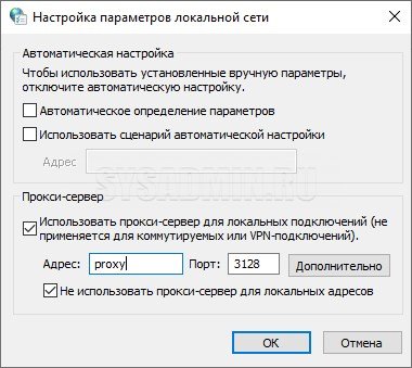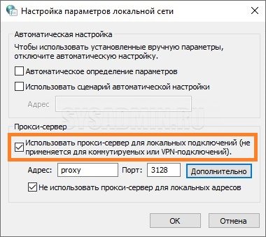 Появится окошко настроек, которое нас интересует. Установите флажки так, как на фото ниже. В полях «Адрес» и «Порт» введите актуальную для выбранного прокси-сервера информацию — в нашем примере это адрес сервера proxy и его порт 3128.