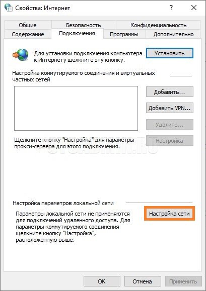 Откроется окно свойств интернета, на вкладке «Подключения«. Нажимаем на кнопку «Настройка сети«.