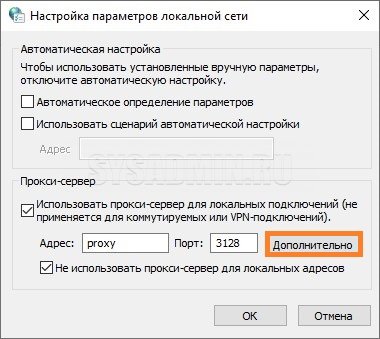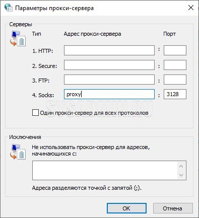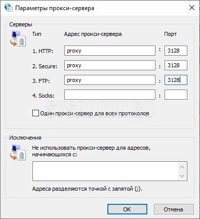 Если тип поддерживаемых протоколов только HTTP и HTTPS, то в окне настроек нажимаем кнопку «Дополнительно«. В появившемся окошке снимите флажок как на фото ниже, а в полях «HTTP«, «Secure» и «FTP» задайте информацию о выбранном прокси. Проверьте, чтобы поле «Socks» было пустым.