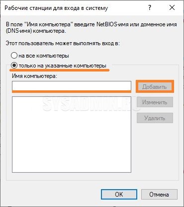- Теперь нужно добавить имена компьютеров, на которых можно заходить данному пользователю. Для этого, нужно переключить чекбокс на значение «Только на указанные компьютеры», в строке ниже ввести имя компьютера, и нажать на кнопку «Добавить».