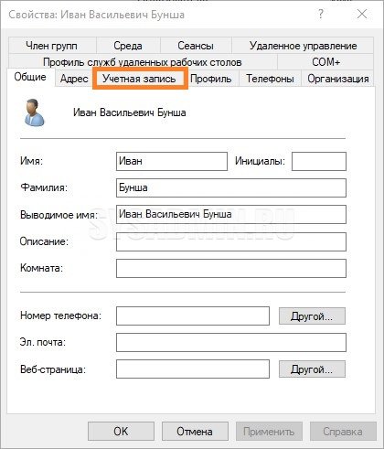 - Находим подходящего пользователя (либо создаем нового), и открываем его характеристики. Там перебегаем на вкладку «Учетная запись».
