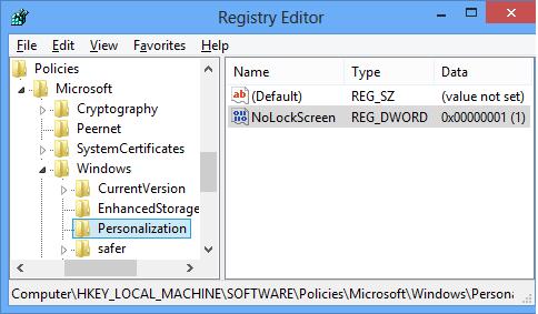 В указанной ветке создайте ключ типа DWORD с именем NoLockScreen и задайте ему значение 1.