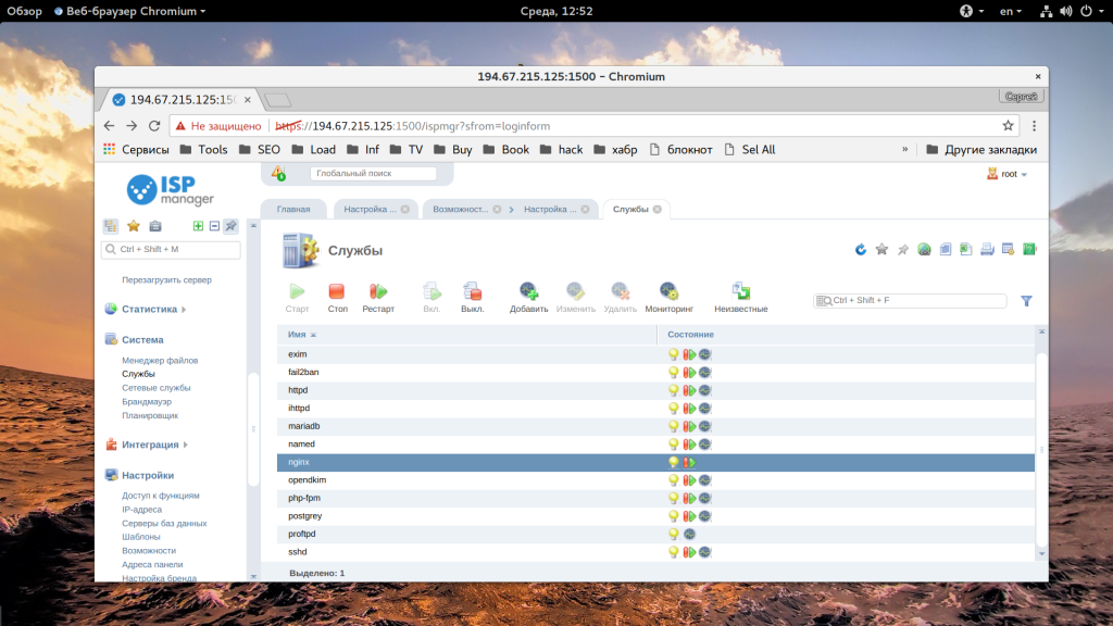 Панель управления VPS ISPManager довольно популярна среди пользователей и если вы используете ее на своем сервере, то можете перезапустить Nginx с помощью нее. Для этого авторизуйтесь в панели, перейдите на вкладку «Система», «Службы», а затем найдите там пункт «Nginx», выделите его и нажмите кнопку «Перезапуск»: