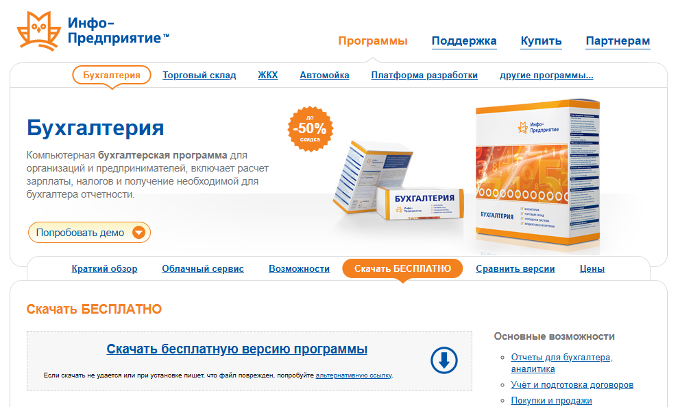Всё очень просто: нет поиска дилеров, торгов, ожидания доставки. Скачал дистрибутив (если главная ссылка не работает – есть другая), установил – начал вести учет.