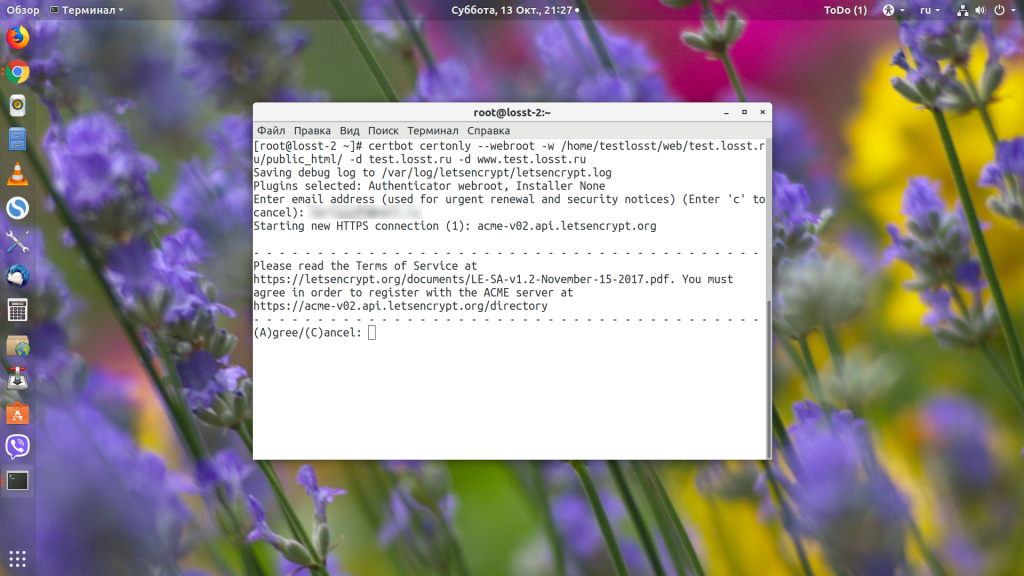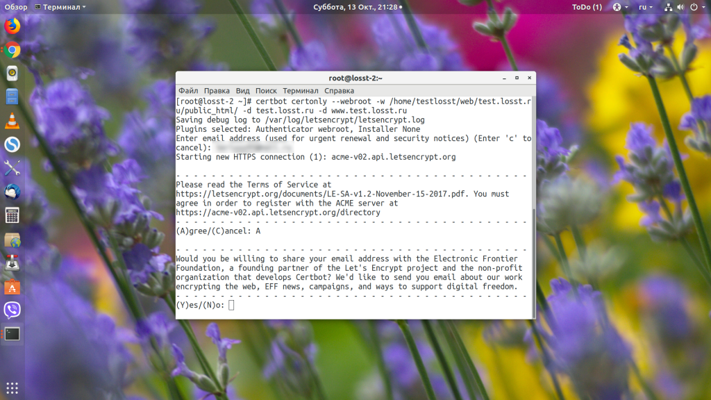 Во время генерации сертификата утилита спросит ваш Email-адрес для аккаунта ACME, на который будут приходить уведомления о необходимости продления и другая информация: