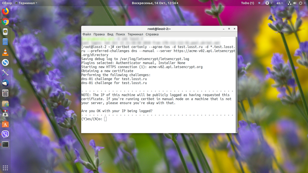 Вы можете сделать это вручную или же использовать dns-плагин для Certbot, чтобы добавить её автоматически. Правда, плагин поддерживается только для популярных сервисов, таких, как DigitalOcean, Linode, Cloudflare и так далее. В этой статье рассмотрим ручной вариант. Команда для генерации сертификата будет выглядеть вот так: