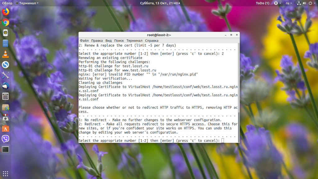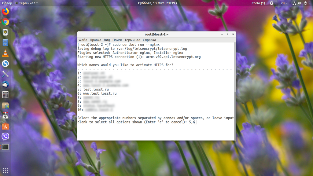 Введите цифру нужного домена или несколько цифр, разделённых запятой. Утилита сама установит всё, что нужно, а затем спросит вас, нужно ли перенаправлять http-трафик на https: