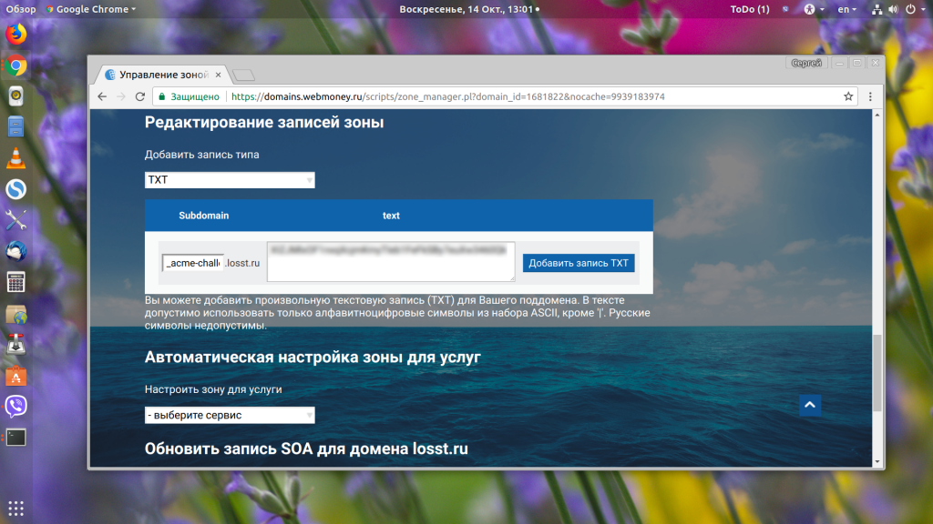 Let’s Encrypt Wildcard-сертификаты появились относительно недавно. Они позволяют использовать один сертификат для всех поддоменов определённого домена, например *.test.losst.pro. Но и работает это всё сложнее — вам надо будет подтвердить, что этот домен принадлежит именно вам. Для этого надо добавить TXT-запись к зоне домена.