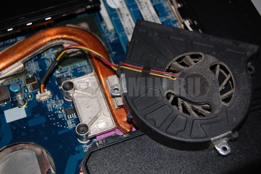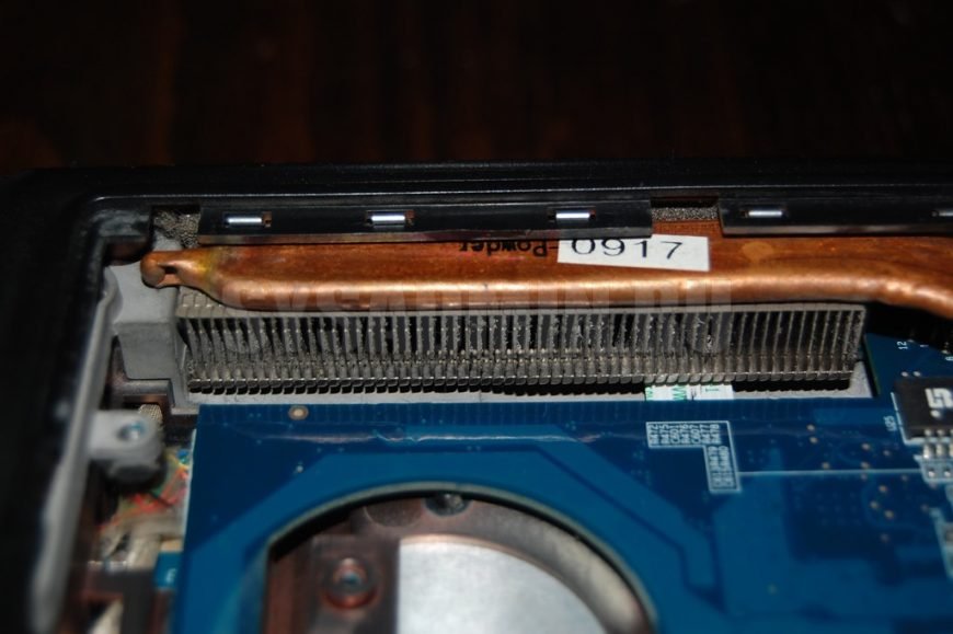 Рассмотрим, как вообще работает СО ноутбука. От компонентов, которые больше всего греются (видео- и обычный процессор) идет медная трубка, обладающая большой теплопроводностью. Т.е. при нагреве процессора практически моментально нагревается часть трубки возле кулера. Кулер берет воздух со стороны крышки, которую мы сняли (с днища), работает на выдув в сторону радиатора, охлаждает трубку и горячий воздух выводится. Во время эксплуатации с днища засасывается пыль и ворса, лопасти загрязняются. Во время работы пыль обволакивает тепловую трубку и забивает щели радиатора. Горячий воздух в полном объеме не выходит за пределы корпуса, тепловая трубка остается горячей. Процессор разогревается и в итоге отключается.