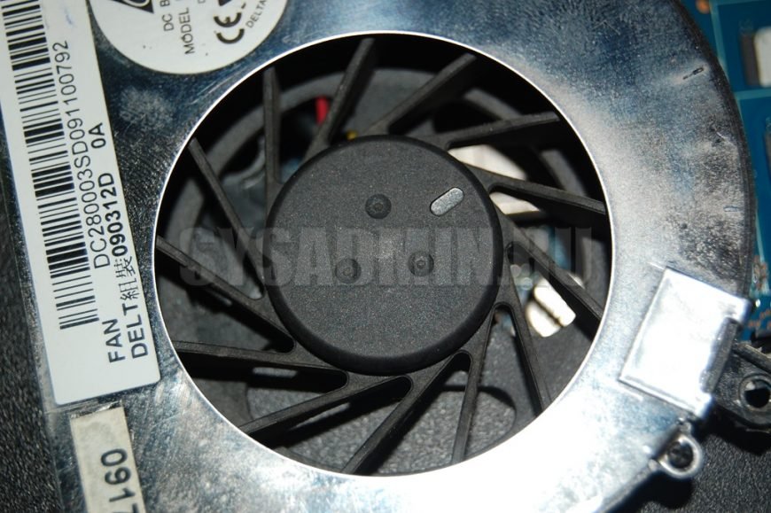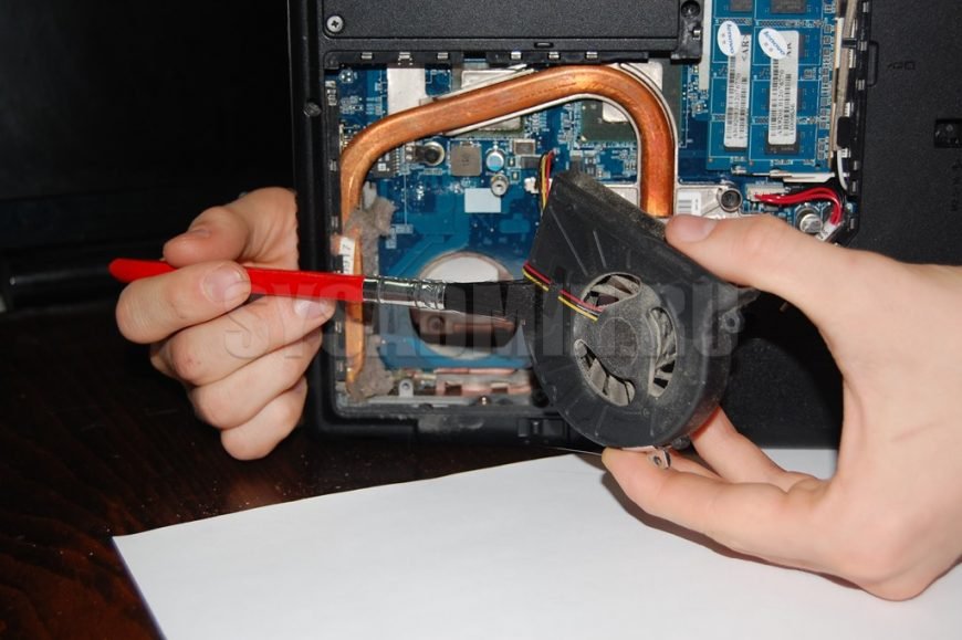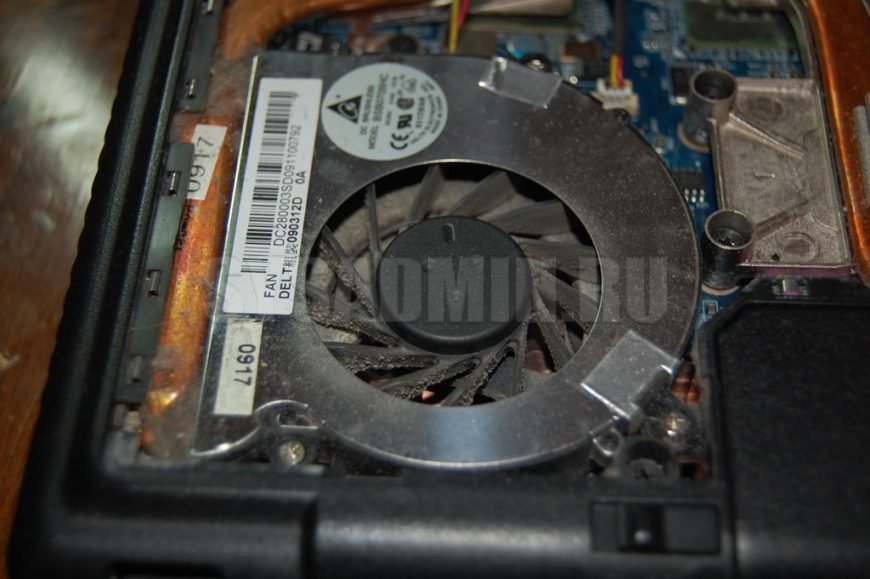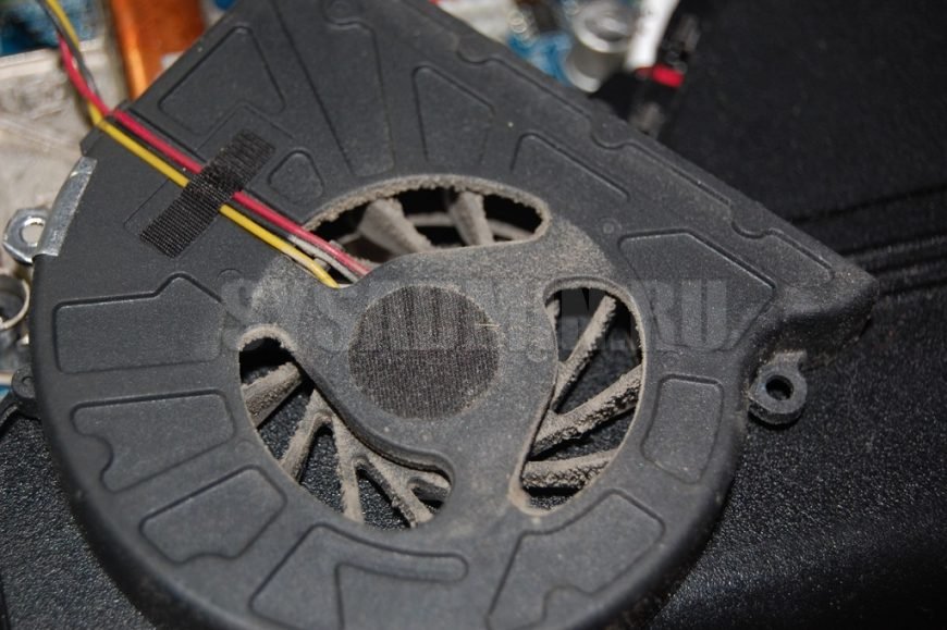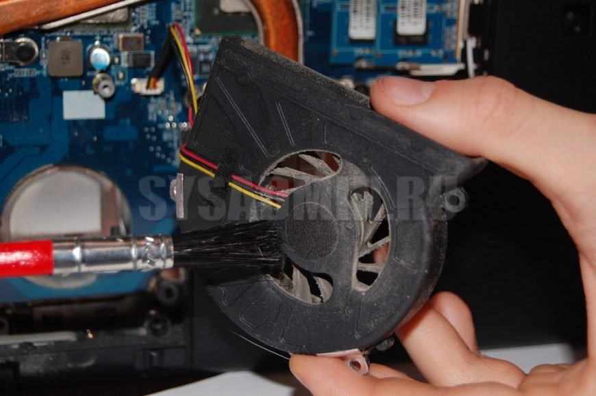 Почистите кисточкой кулер. Я поставил ноутбук на ребро, придерживал рукой и этой же рукой чистил. Если не справляетесь сами, попросите кого-нибудь помочь. Выглядит это следующим образом: