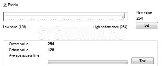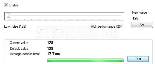 На шкале вы выбираете значение от 128 до 254. Чем выше значение, тем выше уровень шума и выше производительность. При установке маленького числа может увеличиться время доступа. Выбираете значение, нажимаете «Set» и тестируете время доступа («Average access time»). У меня особой разницы не наблюдалось. Так что эту вкладку я бы использовать не рекомендовал.