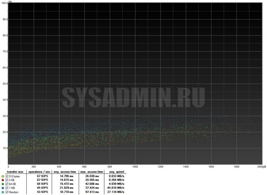 Данный тест измеряет среднее и максимальное время доступа к информации при разных размерах блоков. Также измеряется IOPS и средняя скорость чтения. Блоки разных размеров отличаются по цветам. График выглядит следующим образом:
