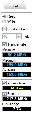 По окончанию теста в окошке справа вы получите какие-то результаты: минимальную, максимальную и среднюю скорость чтения/записи, время доступа, максимальную скорость передачи данных от диска к интерфейсу и обратно (можно вообще не учитывать) и использование ресурсов процессора при активном чтении/записи. Естественно, чем слабее процессор, тем больше будет процент на одинаковом накопителе.