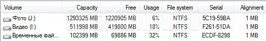 В верхней части окна отображается информация по разделам диска (объем, процент использованного места):