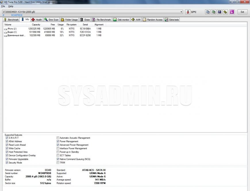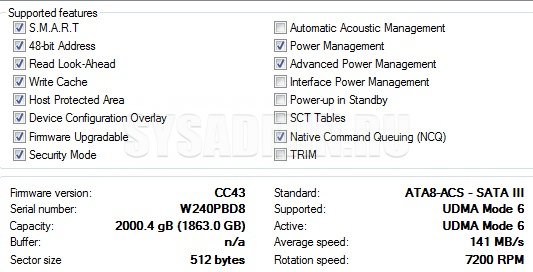 В нижней части показаны поддерживаемые функции и другая техническая информация (номер прошивки, серийный номер, размер буфера, размер сектора и т.п.).