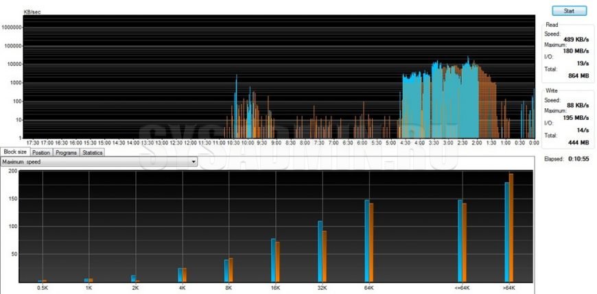 На нижнем графике показана скорость чтения/записи блоков определенного размера, с которыми происходила работа.