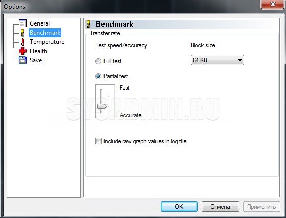 «Full test» – это тестирование всей поверхности жесткого диска. Лучше поставить «Partial test», иначе это займет уйму времени. Ползунок обозначает скорость и объемы сканирования в пределах «Partial test». Размер блока оставьте по умолчанию. При уменьшении значения результаты тестов будут хуже, потому что накопители всегда работают лучше с большими единицами информации. Оставить по умолчанию лучше, потому что при тестировании в лабораториях очень часто так делают и вы сможете сверить ваши результаты с лабораторными.