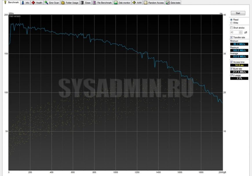 Итак, изначально вверху выбираете накопитель, который хотите протестировать. Во вкладке «Benchmark» все настройки оставляйте по умолчанию и запускайте тест кнопкой «Start». Если в настройках «Benchmark» вы не выставили «Full test», то тестирование пройдет достаточно быстро. Можно выставить «Short stroke» и задать значение. Тогда тестироваться будет только часть поверхности диска.