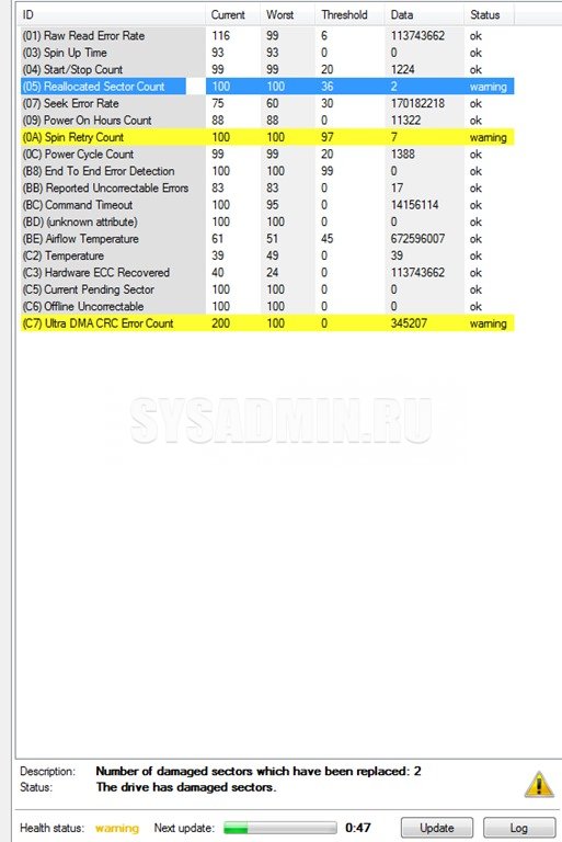 В трех параметрах написано «Status: warning». Нажимаем на один из них. Внизу открывается описание. В моем случае есть 2 нечитаемых сектора, которые переобозначили.