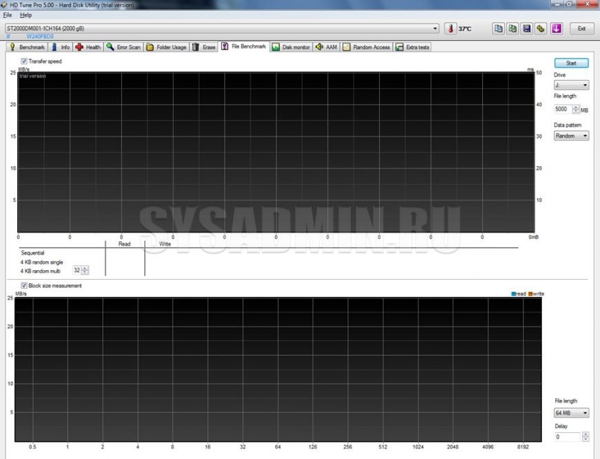 Эта вкладка используется для тестирования скорости чтения/записи информации, только немного более подробного, чем во вкладке «Benchmark». Итак, у нас есть два графика. В первом случае создается файл на разделе тестируемого диска (раздел и размер файла выбирается справа, желательно выбрать размер файла побольше – 5-10 ГБ для более достоверных результатов) и измеряется последовательная (sequential) скорость чтения/записи и операции ввода-вывода причтении/записи блоков по 4 КБ последовательно или одновременно. Именно эти значения (4 KB random single и 4 KB random multi) влияют на общую системную производительность, скорость запуска программ, реакцию программ на действия и т.п. Нормальные значения для жестких дисков 150-500 IOPS, для SSD – на один-два порядка больше. Именно поэтому ставят SSD для ускорения системы.