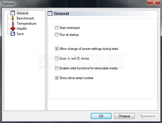 «Enable write functions for removable media» – если отметить, то можно будет проводить тесты записи на съемных носителях (флэшках, картах памяти).