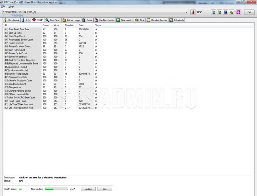Здесь расписаны параметры жесткого диска и их значения. Если внизу написано «Health status: ok», то все в порядке. На втором жестком диске, который постарше, имеются ошибки. Они обозначены желтым цветом.