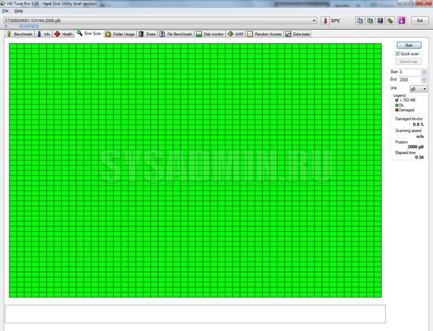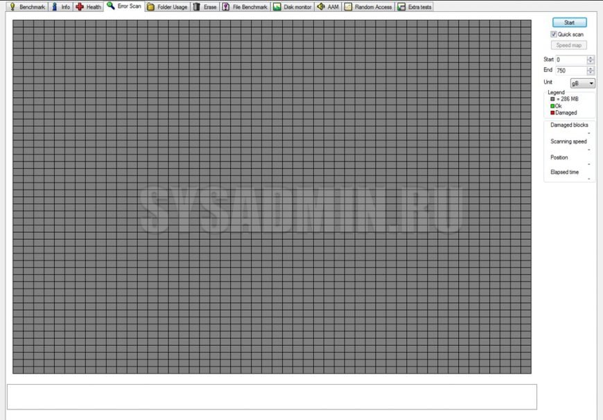 Вся поверхность жесткого диска «разбивается» на много частей в зависимости от объема. Вы можете выбрать полное или быстрое сканирование («Quick scan»). Также можно протестировать только определенную часть поверхности, задавая начальное и конечное значение. Результат будет выглядеть так:
