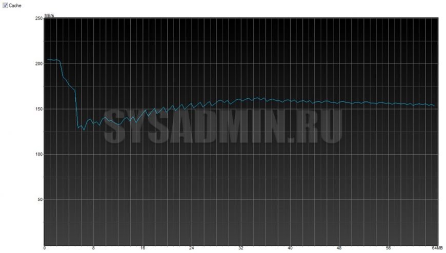 На втором графике отображается скорость чтения/записи блоков разных размеров (от 0.5 КБ до 8192 КБ). В общем случае, чем больше блок, тем быстрее будет происходить чтение/запись. У SSD скорость чтения/записи на маленьких блоках падает не так сильно, чем у HDD. Это обусловлено механикой жестких дисков — маленькие блоки расположены в разных местах, головка должна найти адрес, «долететь» туда, прочитать информацию и опять начать позиционирование. В SSD только электронная память – как в ОЗУ, только энергонезависимая и менее скоростная.