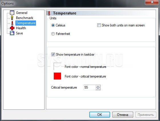 Здесь задается вывод температуры в Цельсиях и/или Фаренгейтах, вывод температуры в панели задач. Если температура жесткого диска превысит заданную в этом окошке, то выскочит соответствующее сообщение и значение окрасится в красный цвет (или какой там вы выставите).