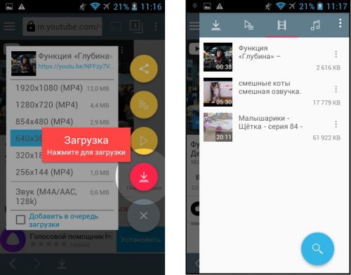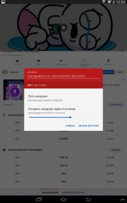 Через мгновение появится список доступных форматов и размеров файлов для загрузки, выбрав необходимый, еще раз жмем на красный кружок со стрелочкой, и видео сохраняется по умолчанию в папке Video в памяти телефона. В соответствующем разделе в приложении отображается список всех скаченных роликов.