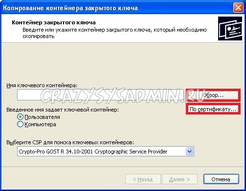 Откроется новое окошко, где будет предложено выбрать ключевой контейнер. Сделать это можно либо по сертификату, либо вручную указать контейнер.